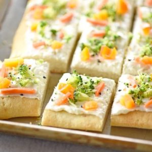 - Cut and Present the Pizza: Use a sharp knife or pizza cutter to cut the pizza into squares or rectangles. Arrange the pieces on a serving platter for parties, brunch, or casual snacking. Each piece should have a perfect combination of crust, creamy cheese, crunchy vegetables, and flavorful seasoning, creating a visually appealing and tasty treat.