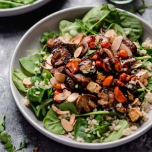 Packed with fiber-rich vegetables, plant-based protein from quinoa, and heart-healthy fats from olive oil and almonds, it’s both wholesome and delicious.