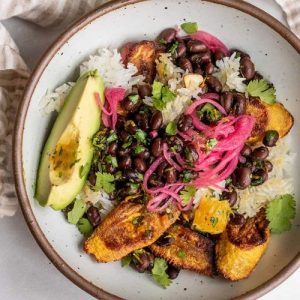 - Assemble the Bowls: Start by placing a portion of the crispy garlic rice at the bottom of each bowl. Layer roasted plantain slices on top of the rice. Spoon a generous portion of the marinated black bean salad over the plantains. Add sliced avocado and a few pickled red onion rings for extra texture, flavor, and color. Drizzle any remaining orange vinaigrette from the black bean salad over the bowl for a bright, tangy finish. Optionally, garnish with lime wedges for a zesty touch.