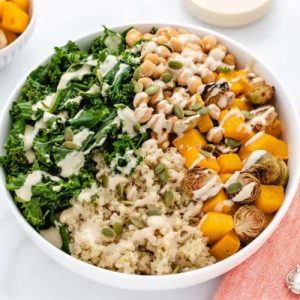 - Serve and Enjoy Immediately: Serve the bowls warm for maximum comfort and flavor. The combination of fluffy quinoa, caramelized vegetables, crispy chickpeas, and creamy dressing makes this dish deeply satisfying. It’s hearty enough to stand alone as a main course yet light and balanced, making it ideal for both lunch and dinner.