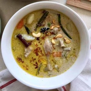 This Kerala-inspired Chicken and Vegetable Stew blends tender chicken with a medley of vegetables, simmered in aromatic coconut milk enriched with whole spices.