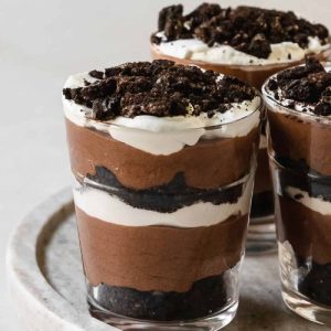 Indulge in this luscious chocolate parfait, a no-bake dessert that layers silky chocolate mousse, fluffy whipped cream, and crunchy cookie crumbs for a heavenly treat.