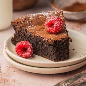 - Serve with Fresh Raspberries: Using the parchment overhang, carefully lift the cooled torte from the pan and transfer to a serving plate. Garnish with fresh raspberries for a beautiful presentation and bright, tangy contrast to the rich chocolate. Slice into eight portions and enjoy.