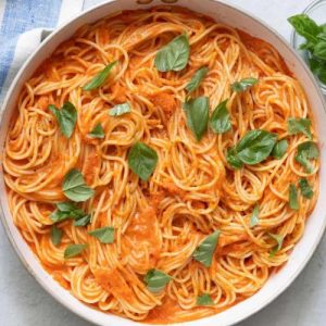 - Serve and Garnish: Transfer the pasta to serving plates. Tear fresh basil leaves and sprinkle them generously over the top for aroma, flavor, and a pop of green color. The fresh basil perfectly complements the roasted pepper sauce, enhancing the dish’s flavor complexity.