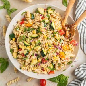 - Prepare the Salad Base: In a large mixing bowl, combine the cooled pasta, grilled zucchini, corn kernels, quartered grape tomatoes, diced red onion, and chopped fresh basil. Toss gently with a spoon or spatula to evenly distribute the vegetables without crushing them. This step creates the colorful foundation of your salad, making every bite visually appealing and flavorful.
