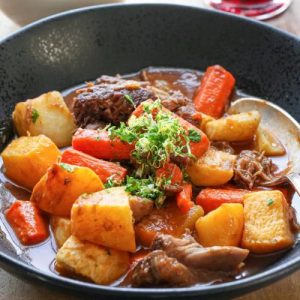 A crisp green salad with a lemon vinaigrette balances the richness, while a bold red wine, such as Syrah or Cabernet Sauvignon, enhances the stew’s deep flavors.