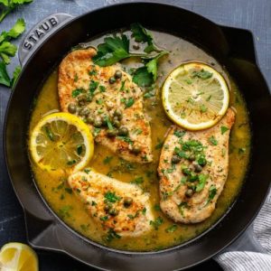 Thin, tender chicken cutlets are cooked in a tangy lemon and caper sauce, creating a protein-packed, low-carb meal that’s satisfying and light.