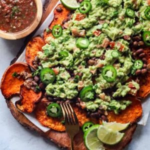 Crispy roasted sweet potato rounds replace chips, topped with seasoned black beans, creamy avocado, and zesty salsa.