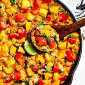 Absolutely. Replace chicken with firm tofu, tempeh, or chickpeas, and swap fish sauce with soy sauce or tamari. Coconut milk and mango provide the same rich texture and sweetness.