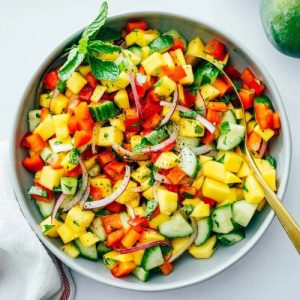 This vibrant mango salad blends juicy tropical mangoes with crisp vegetables and fresh herbs, creating a refreshing, flavor-packed dish.