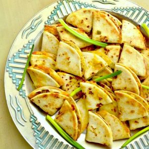 For a fun party platter, arrange quesadilla wedges with bowls of salsa, pico de gallo, and sliced jalapeños for guests to customize their bites.