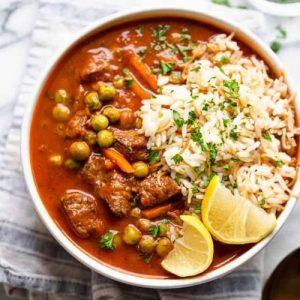Tender beef, vibrant vegetables, and aromatic spices combine to create a hearty meal rich in protein, fiber, and essential vitamins.