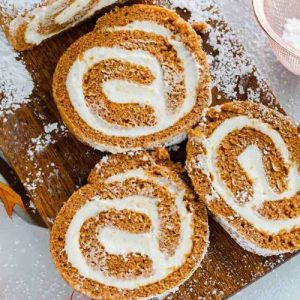 Serve slices of pumpkin roll chilled or at room temperature for the perfect balance of soft cake and creamy filling.