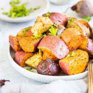 These roasted beets, potatoes, and carrots make a versatile side dish.
