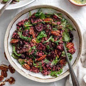 Loaded with plant-based protein from quinoa, fiber from beets and greens, and heart-healthy fats from olive oil and nuts, it’s a balanced meal that fuels your body.