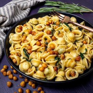 This roasted chickpea pasta with spinach is a quick, flavorful dish that balances creamy, garlicky goodness with a satisfying crunch from golden roasted chickpeas.