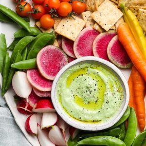 Serve it chilled with an assortment of fresh vegetables like crunchy carrots, cucumber sticks, radishes, or snap peas for a refreshing snack.