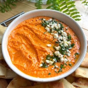 This Roasted Red Pepper Feta Dip blends smoky sweetness with a creamy, tangy kick, making it a flavorful crowd-pleaser.