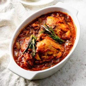 Tender chicken thighs simmer in a rich tomato and herb sauce infused with garlic, rosemary, and anchovies for natural umami depth.