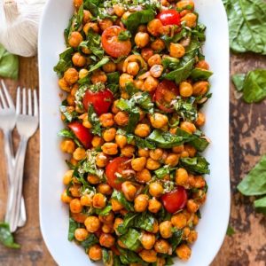 The roasted chickpeas provide plant-based protein and fiber, while fresh spinach and cherry tomatoes deliver vitamins and antioxidants.
