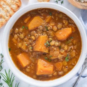 Yes! Start by sautéing the vegetables in a pan first for richer flavor, then transfer to the slow cooker with all other ingredients. Cook on low for 6–7 hours or on high for 3–4 hours until lentils and sweet potatoes are tender.