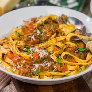 Tagliatelle Bolognese is an elegant, hearty dish best served hot and freshly plated.