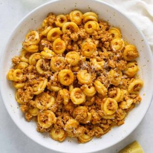 - Combine Pasta and Sauce: Add the cooked pasta directly into the sauce along with ½ cup of the reserved pasta water. Gently toss with a wooden spoon to coat the pasta evenly in the creamy turkey bolognese. If needed, add more reserved pasta water, a little at a time, until the desired consistency is reached. This ensures every strand or piece of pasta is coated in flavorful sauce.