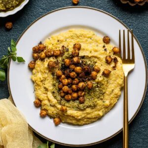 Creamy polenta pairs beautifully with nutrient-packed pesto and crispy chickpeas, creating a deliciously balanced dish.