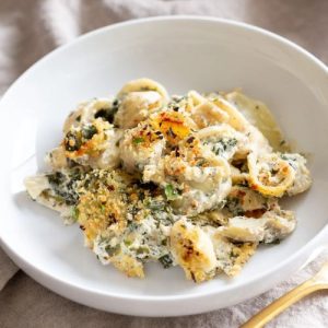 Yes! Simply use gluten-free pasta and gluten-free breadcrumbs for the topping. The bake will taste just as creamy and flavorful without any compromise.